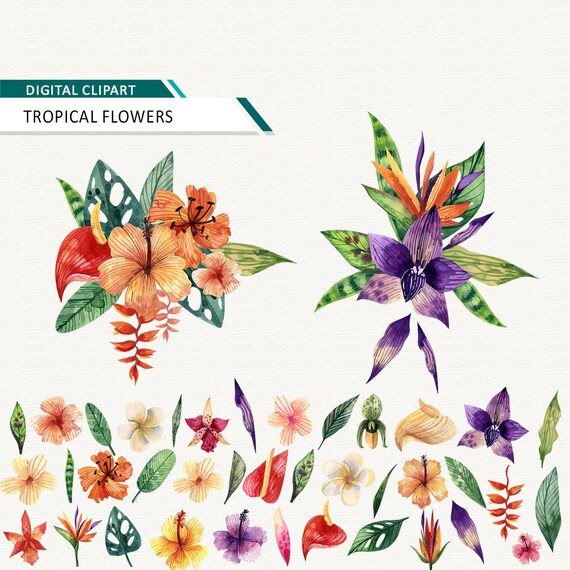 Tropical Flowers Clipart Watercolor Tropic Vector Exotic Etsy