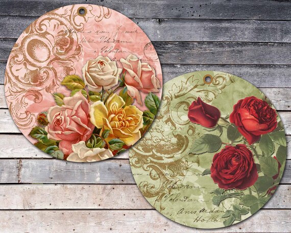 Shabby Roses Round Tags Floral Printable Coasters Shabby Etsy